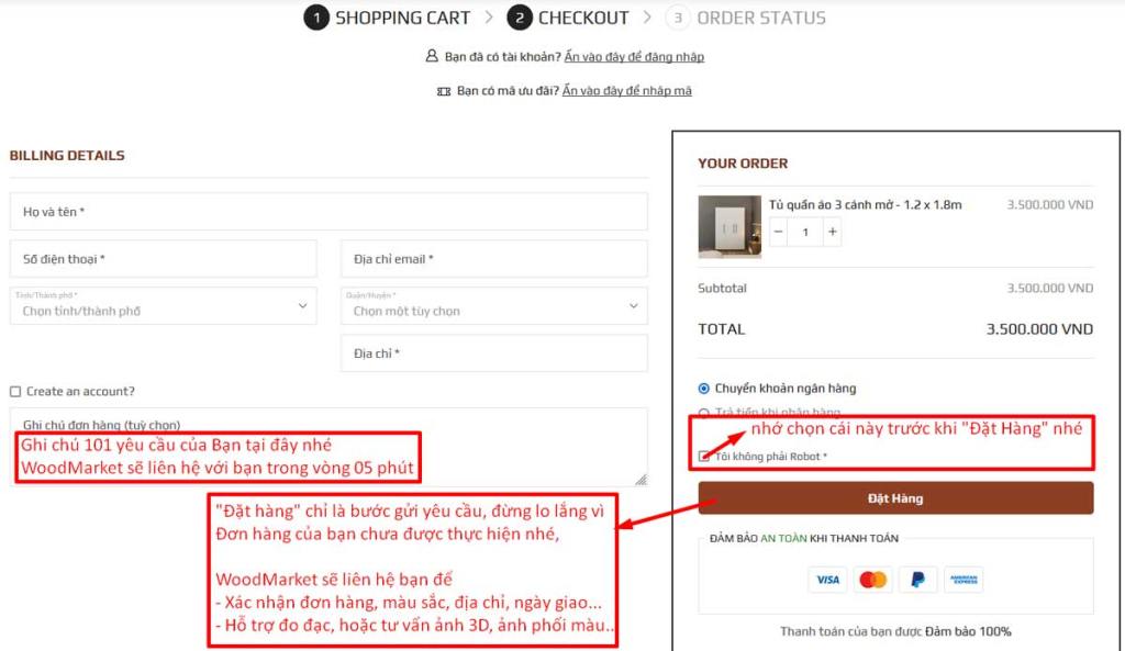 Ở bước “Check out”, vui lòng để lại thông tin liên hệ của Bạn để WoodMarket sẽ liên hệ & hỗ trợ cho bạn nhé.